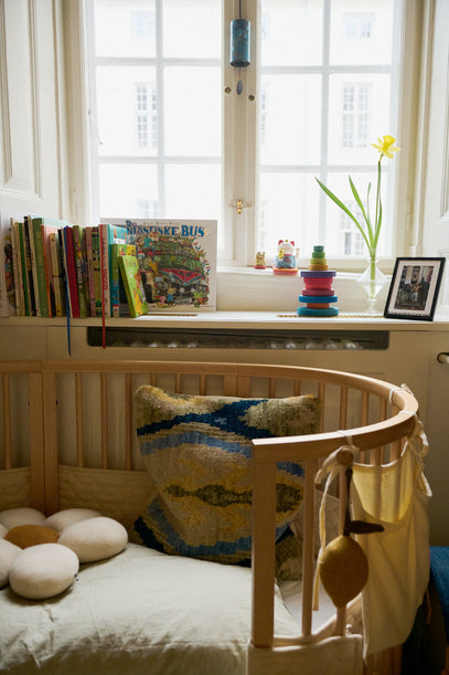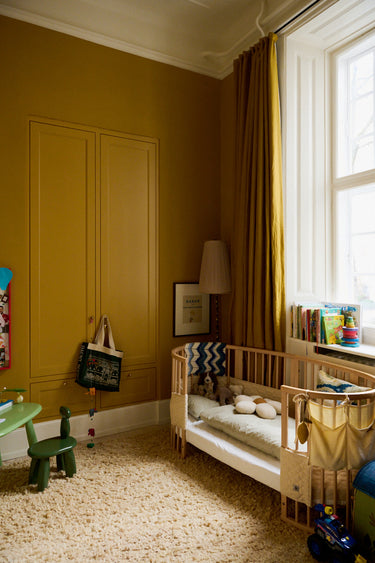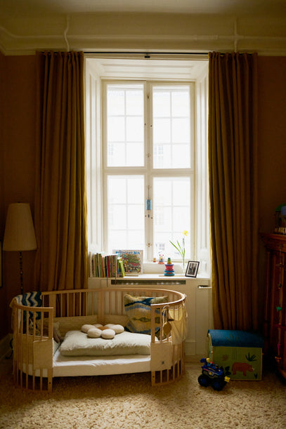 Nanna, Axel's mom, fell in love with Thorvaldsen's Museum while being pregnant with Axel, and decided then that Axel's room should take inspiration from there. The result: Warm yellow walls and long, yellow, shiny curtains that almost embrace you as you enter.