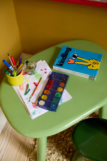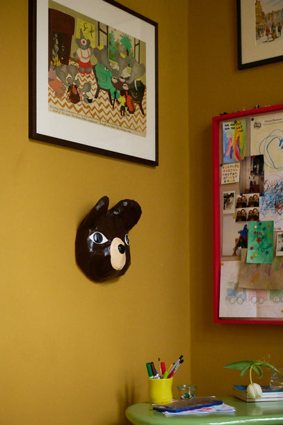 A papiér-maché bear hangs on the wall by the little green table and chair set that Axel refers to as his "office space".