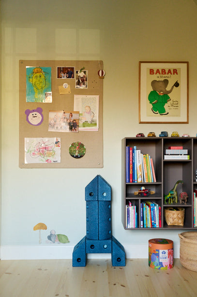 Pictures and little paintings are saved on the pinboard that Malte's mother made years ago, using a masonite board and covering it with linen. The MODU elements on the floor are transformed into a rocket.