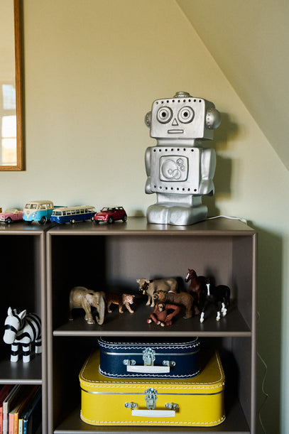 Books, little animals and toy cars are placed on the shelf from Montana. A robot lamp is used at night time and during the night, together with the mushroom lamp that is placed by the bed.