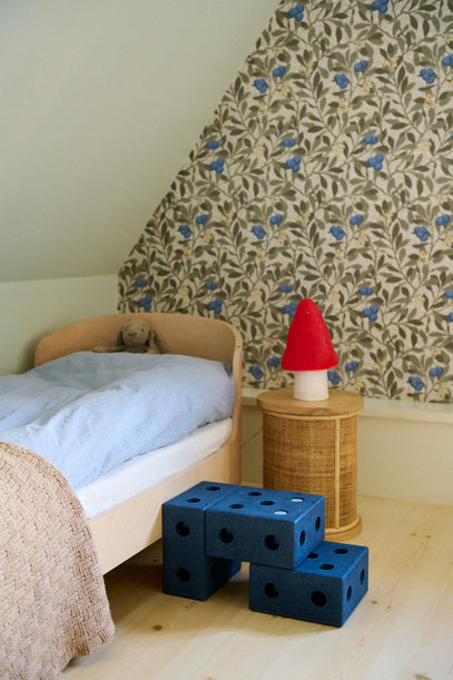 Malte's bed is placed in a cosy corner of the room, to the left of the window. Next to the bed, on the bed side table, is a small red mushroom lamp.