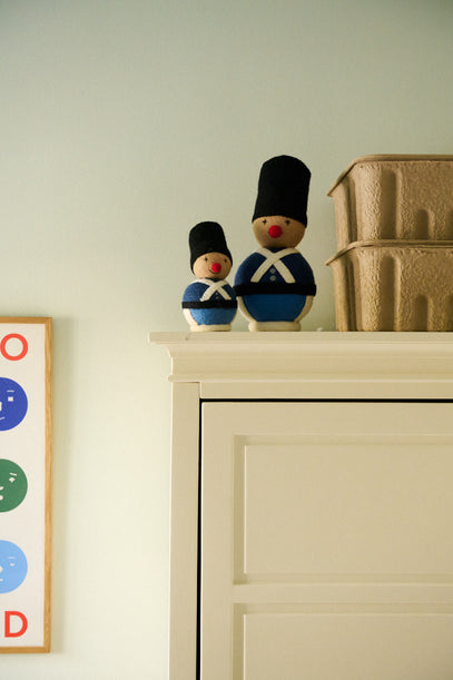 A medium and a large wool guard are placed on top the cupboard from Oliver Furniture, which was bought second hand and fits right in.