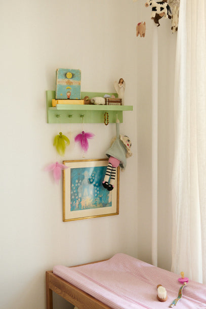 A wooden changing table is placed in the corner, framed by a beautiful painting, a green shelf and little fairies.