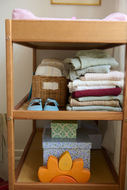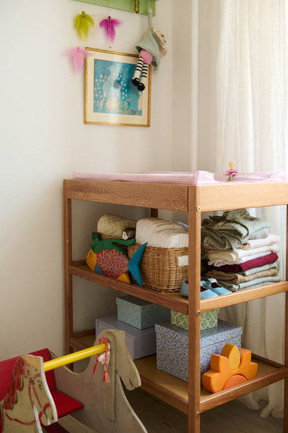 There is a gentle softness in here, beautifully captured in this corner with the wooden changing table, a pink changing cover, a soft brush and the handmade pacifier clip with matching pink pacifier.