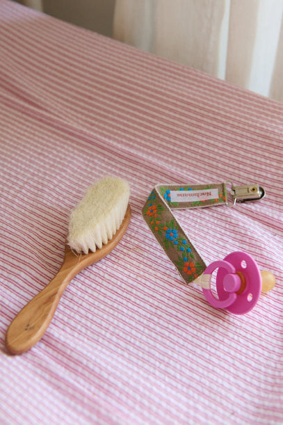 The pink striped changing cover is handmade, sown by Margot's grandmother. The pacifier clip is from Nachmans and pairs perfectly with the pacifier in colour bubblegum.