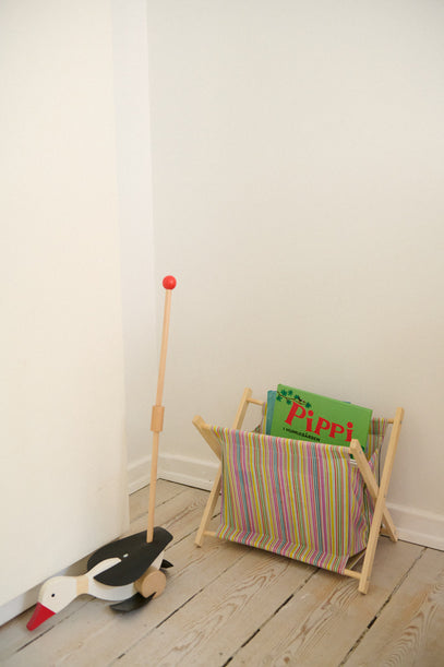 Books are stored in a fabric magazine rack, including Pippi i Humlegården and next to it; a duck-on-a-stick walking toy.