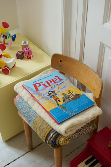 The wooden push wagon gives a little helping hand as Margot learns to find her balance. Inside it, her favourite doll in cherry red and a stack of classic Astrid Lindgren books including Kender du Pippi Langstrømpe?