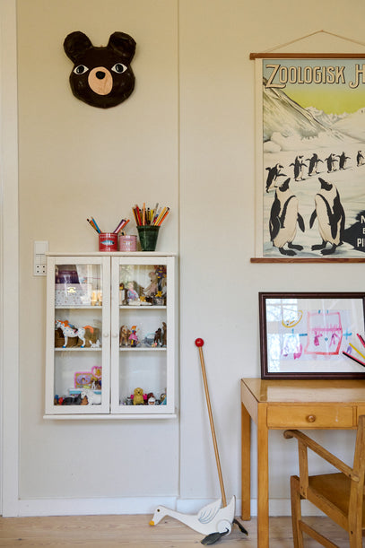 Miniature figures and animals have their place in the white hanging cabinet. Two tin cans are placed on top of the cabinet, used to store colour pencils. On the wall above hangs a papier-mâché bear.