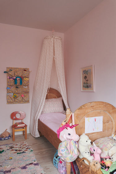 A handmade wall-storage piece, made by Olga's mom from Liberty fabrics, adds a soft touch to the room. Here, Olga keeps a Hanger, smaller teddies and toys, and a Mason Pearson brush.