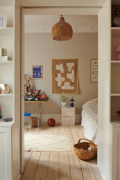A look from the living room and into Olga's room. Her room is naturally divided into two zones: One zone on the right for reading, relaxing and sleeping, and one zone on the left for crafting and creating.
