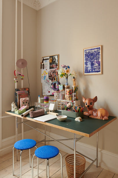 Two stools, one for Olga and one for a friend, are placed by the Egon Eiermann desk, where Olga often does her crafts and creations.