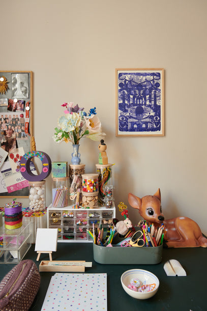 A world of craft everywhere on the desk, plus the large and lovely Bambi Light. Olga's handmade paper flowers, that she loves to make, are placed in a little vase.