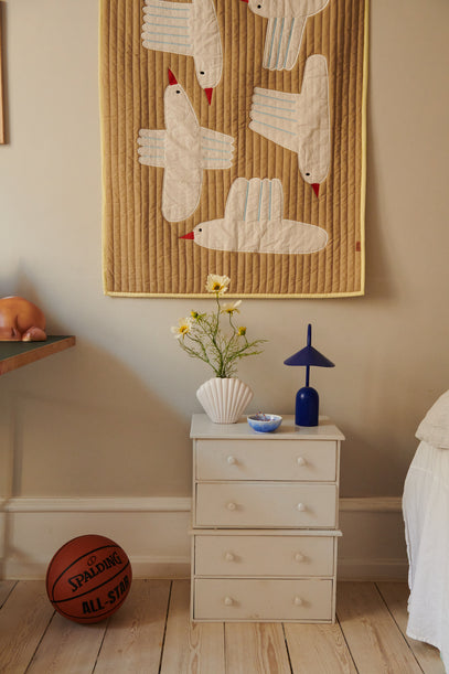 The quilt on the wall adds a soft touch to the room, while the blue lamp gives contrast to the beige and white.