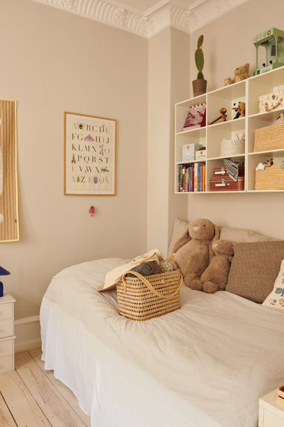 A shelf by the bed creates a cosy atmosphere, and this is where Olga keeps her books, some toys and other storage elements.