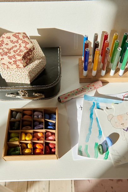 All the colours of the rainbow in this box of rock crayons. Also, a kaleidoscope for fun shapes and more rainbow colours.