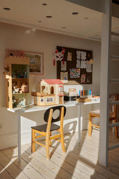 A shared desk and two chairs have been placed underneath the loft bed, allowing for the girls to play, draw and make puzzles while keeping things off the floor.