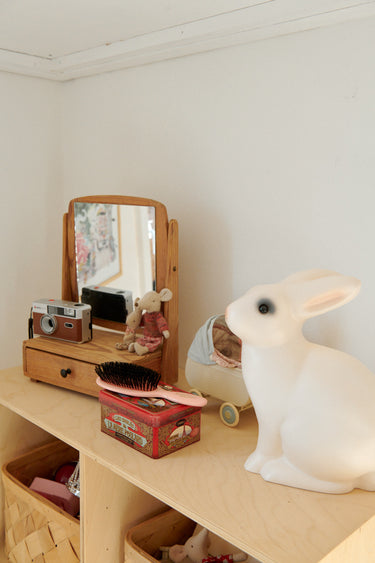 The space underneath the bunk bed is cleverly used for storage and space to play. Here, a raffia box on the floor is used to store toys – find similar raffia boxes here – and a little shelf makes for a great place for the bunny lamp.