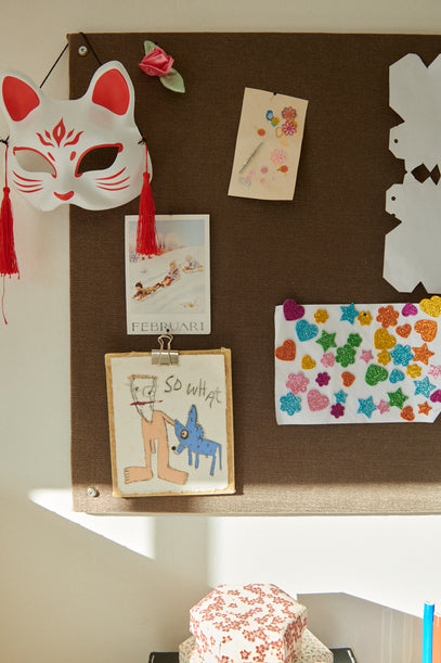Boxes for stuff and a handmade pin board for drawings, invitations, pictures, a cute Elsa Beskow postcard and other keepsakes.