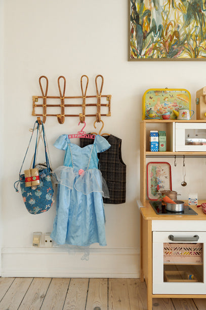 A cute pink hanger is used for an Elsa dress; the little kitchen is where the girls play restaurant, and serve only their favourites dishes. A picnic tea set is used to pour afternoon tea.