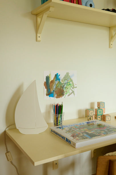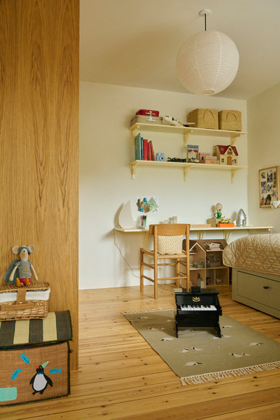 Shelvings above the table keep toys, books, and everyday items organized and easily accessible when needed. Two open raffia baskets are used for storage – see other colours here. A spaceship lamp is placed on the table; alongside creative projects and a game of backgammon.