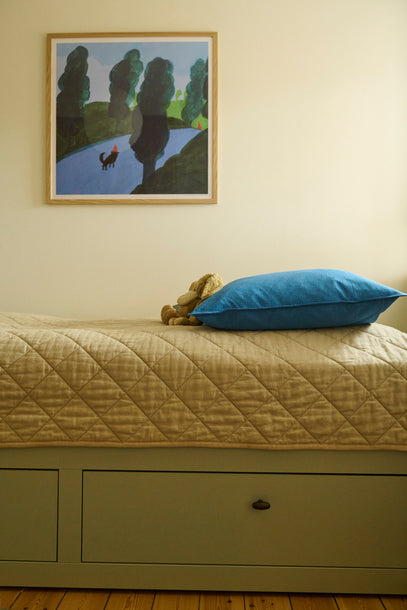 Vincent & Rose's shared bed, made up for day, with a large blue pillow. Above, the poster 'Pimme & Nissen på Eventyr'