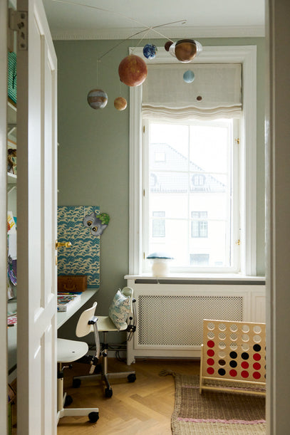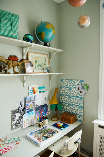 The walls have been painted with 'Cromarty' from Farrow and Ball – a different colour from the rest of the home to illustrate that this is Theo's room. The light green pairs well with the 'Elefanterne Gemmer Sig' poster.
