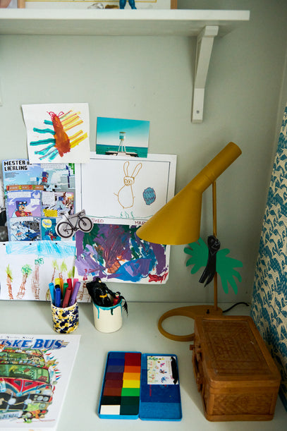 A mix of drawings, postcards, Theo's great grandmother's old rattan box that was used to store her jewellery, block crayons and the book 'Den Fantastiske Bus'.