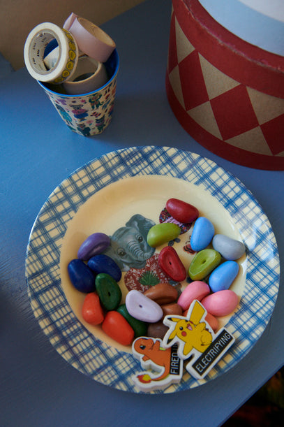 Valdemar loves Pikachu and he loves to draw. A bowl and cup from Rice – in a wonderful collaboration with artist Natalie Lété – are used to store some of his stationary and soy wax crayons for drawing.