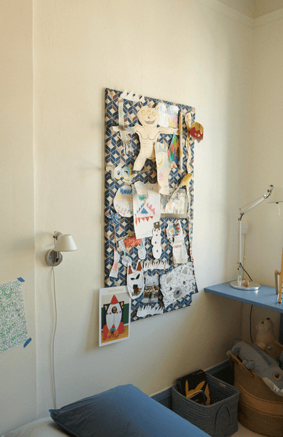 A Tolomeo wall light hangs by Valdemar's bed giving a cosy light. Next to it hangs a pin board, made by Valdemar's mom.