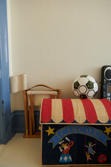 Walls have been kept white while the door frame and panels have been painted in a beautiful blue from Farrow & Ball, creating a lovely contrast. A large circus raffia basket from Rice is used to store toys.