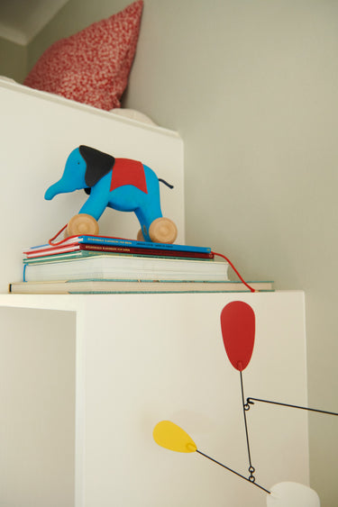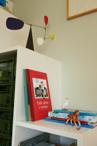 On the shelf is a Paris Mobile, Otto the Elephant and Palle Alene i Verden – one of the classic picture books out now in a new edition from Gyldendal.