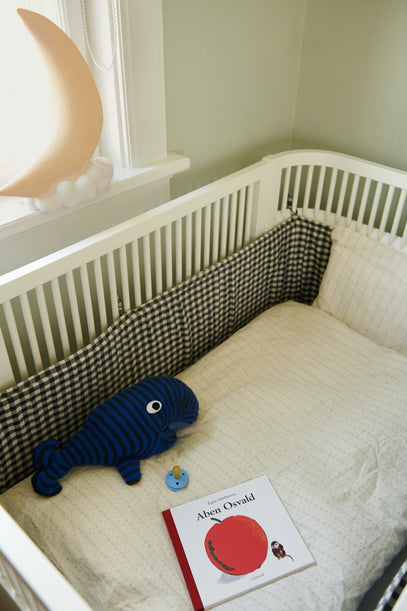 A look inside Valdemar's crib, and here lies a knitted whale, a sky blue bibs pacifier and the new edition of the classic book Aben Osvald by Egon Mathiesen.