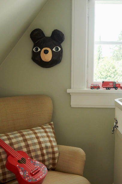 On the wall hangs a papier-mâché bear, and in the window are little cars. The guitar is from Konges Sløjd.