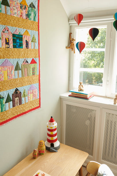 On the table is the Light House Lamp, and in the window hangs the Five Balloons Mobile.