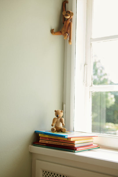 The custom built shelf/nook makes for a cosy little place by the window, where Valdemar's Juno bed fits right in. In the window sits the Moon Lamp, and a papier-mâché bear hangs on the wall.