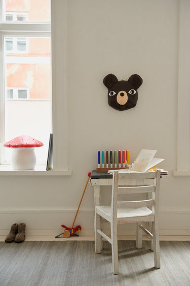 2-year-old Vincent's room is crisp and clear, and decorated in classic Scandinavian tones of browns, white, blues and greys alongside the occasional pop of colour.