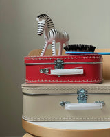 This cardboard suitcase come with cream coloured thread overstitching, and with a metal lining protecting the edges.