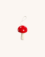 A cute and decorative red mushroom Christmas ornament made from wool.