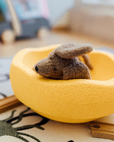 A single balancing/stacking/sitting block in a beautiful yellow colour.