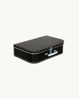 This cardboard suitcase come with cream coloured thread overstitching, and with a metal lining protecting the edges.