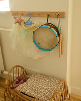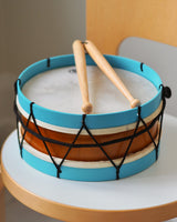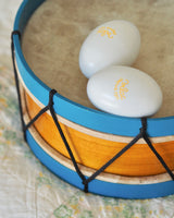 This colourful, classic drum is made from wood and real skin, and comes with two wooden drum sticks. The drum is ready to be carried around and may be played on, on both sides.