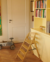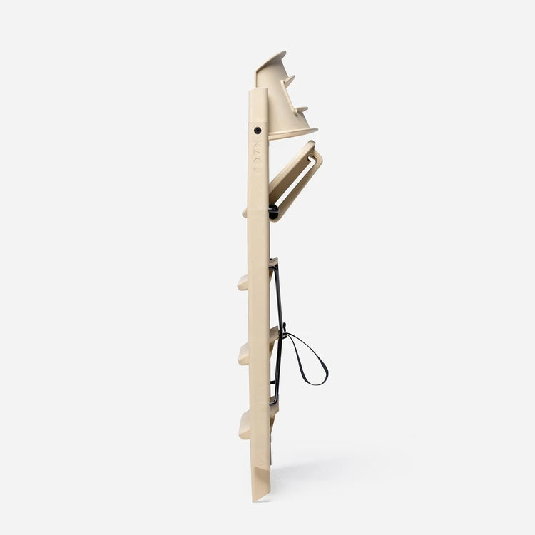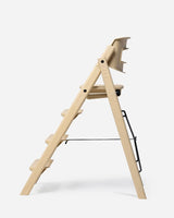 The ladder allows your child to climb up and down the chair on his/her own. At the same time, your child gets an ergonomic and comfortable posture from being able to sit by themselves (with safety rail at about 6-8 months of age) and up to the age of 6-8 years. The legs rest naturally at the different steps as they grow.