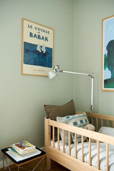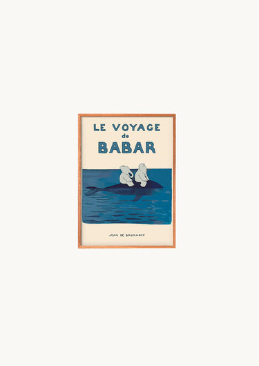 This wonderful print in blue and cream tones features Babar on a whale, swimming in the ocean. A lovely poster for the nursery or the kid's room.