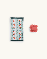 Illustrated wooden bed including a floral comforter and striped fabric pillow. A beautiful bed for small stuffed animals or dolls to get tucked in at bedtime.