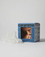 Extra nipples that fit both sizes of the Caramma support bottles (small 150 ml and large 300 ml.).