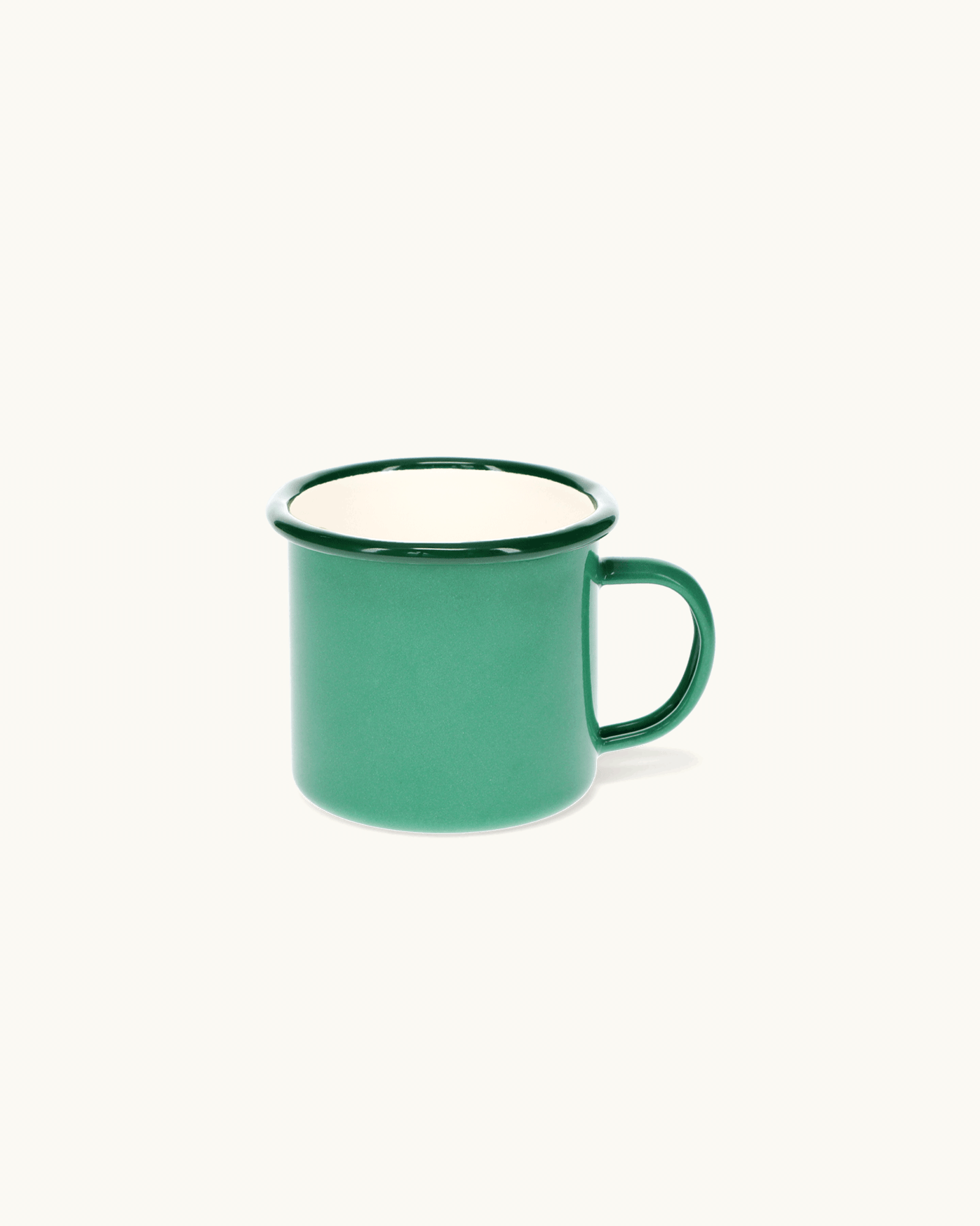 A cute little enamel cup with a handle. Perfect for hot chocolate in the forest or hot tea in the garden at home.