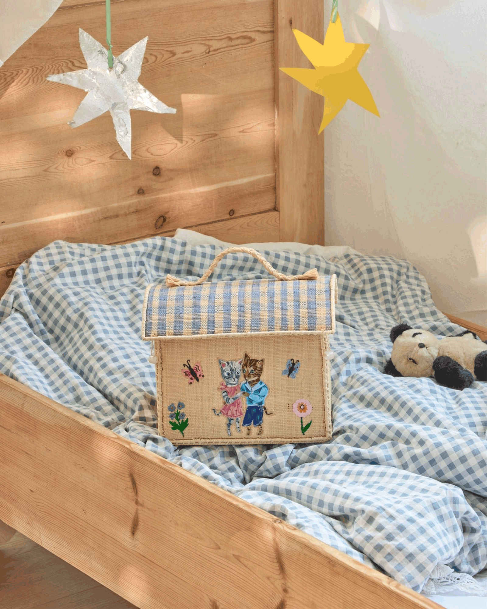 A cute small raffia basket from the Nathalie Lété collection. Nathalie ia well-known French artist, admired for her colorful and imaginative universe. Her work is filled with animals, flowers, and characters.